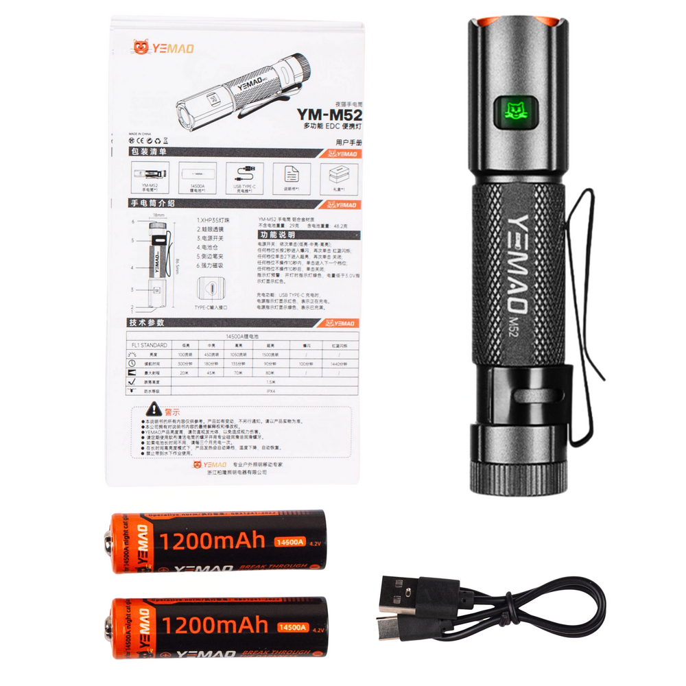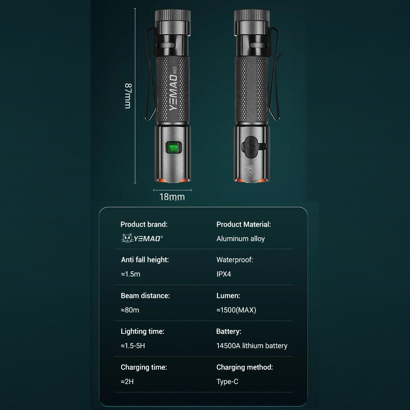 Ліхтар YEMAO YM-M52 поєднує високу яскравість і компактні розміри. Оснащений світлодіодом нового покоління, який забезпечує до 1500 люмен, що дозволяє використовувати його як вдома, так і на вулиці, у походах або при ремонті автомобіля.