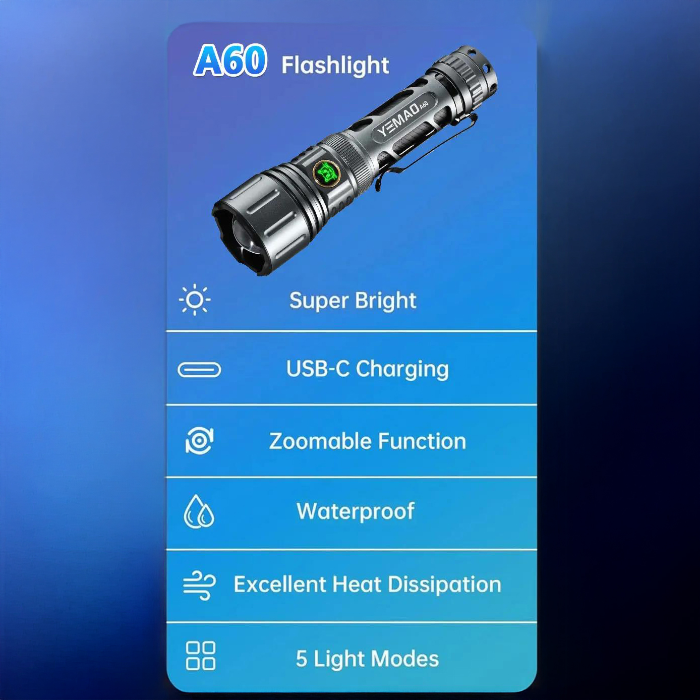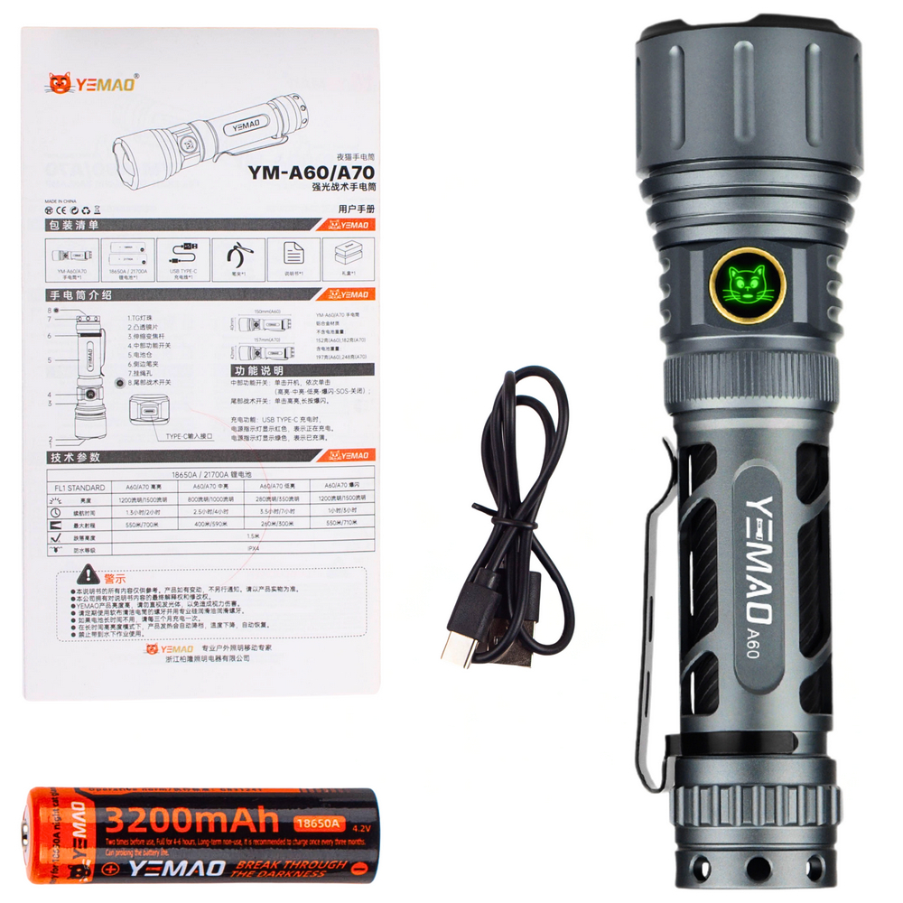 YEMAO YM-A60 — компактний багатофункціональний ліхтар, який поєднує потужність, універсальність та надійність. Завдяки легкій вазі (всього 0,21 кг з акумулятором) та розміру 15 × 4 × 4 см він легко поміщається в кишені, рюкзаку або автомобільній аптечці. Ідеальний для туризму, повсякденного використання, ремонту та екстрених ситуацій.